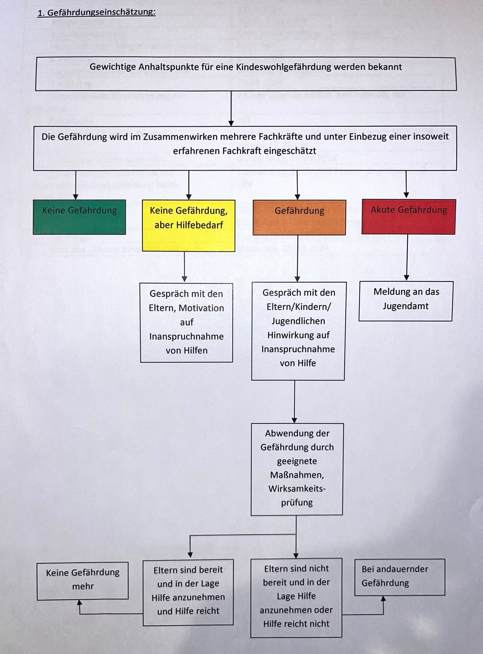 Schwierige familiäre Lebenssituationen können überall vorkommen. Sollte also ein Verdacht der Kindeswohlgefährdung auftreten, muss, zum Wohle des Kindes, schnellstmöglich gehandelt werden. Gewichtige Anhaltspunkte, die „Auslöser “ der Wahrnehmung des Schutzauftrages nach § 8a SGB VIII sein können, um das Wohl eines Kindes zu gewährleisten, sind körperliche und seelische Vernachlässigung, seelische Misshandlung, körperliche Misshandlung und sexuelle Gewalt. Diese Anhaltspunkte geben Hinweise oder Informationen über Handlungen gegen Kinder oder Lebensumstände, die das leibliche, geistige oder seelische Wohl des Kindes gefährden, unabhängig davon, ob sie durch eine missbräuchliche Ausübung der elterlichen Sorge, durch Vernachlässigung des Kindes, durch unverschuldetes Versagen der Eltern oder durch das Verhalten eines Dritten bestehen. Da es sich bei Kinderschutz um einen gesetzlichen Auftrag handelt, muss bei Verdachtsfällen verantwortlich damit umgegangen werden. Sie finden im Anschluss den Handlungs- bzw. Notfallplan: